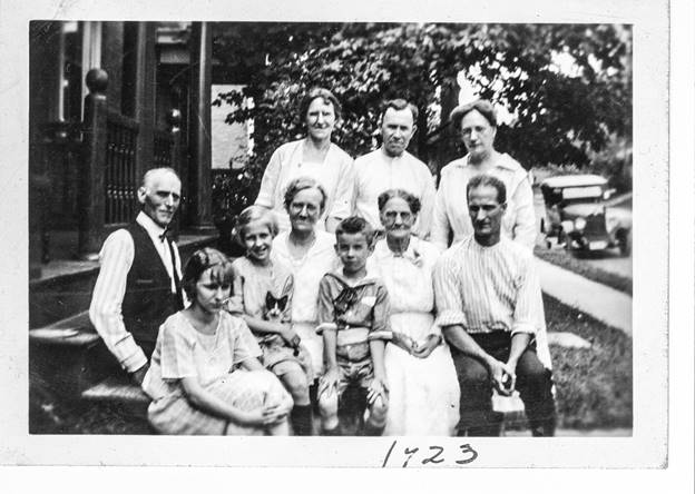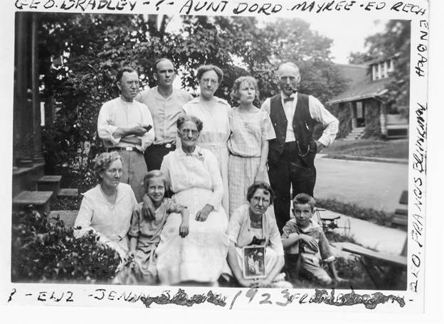 Georgia “Georgie” Brinkman (daughter of George F. Brinkman and Jennie Henderson); Edward Rechenbach (husband of Georgia); Jennie Henderson (wife of George F. Brinkman and mother of Georgia, Edna, and Raymond O. Brinkman); Raymond O. Brinkman; Edna Brinkman; and George F. Brinkman.